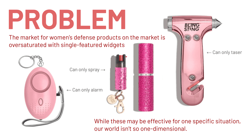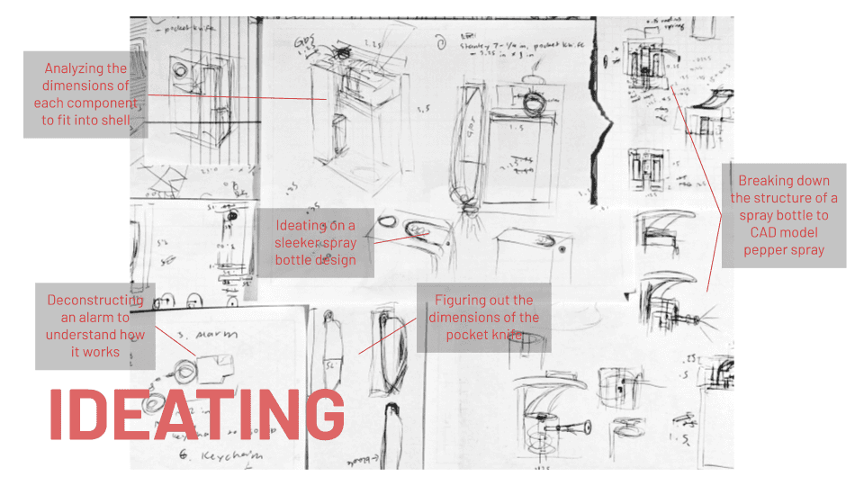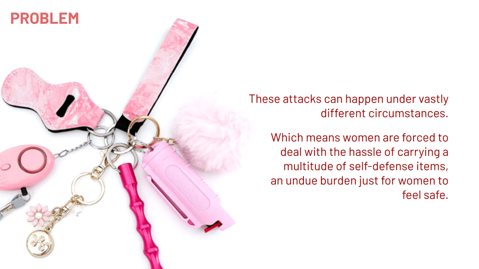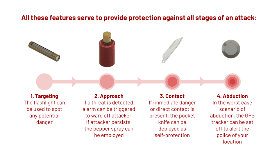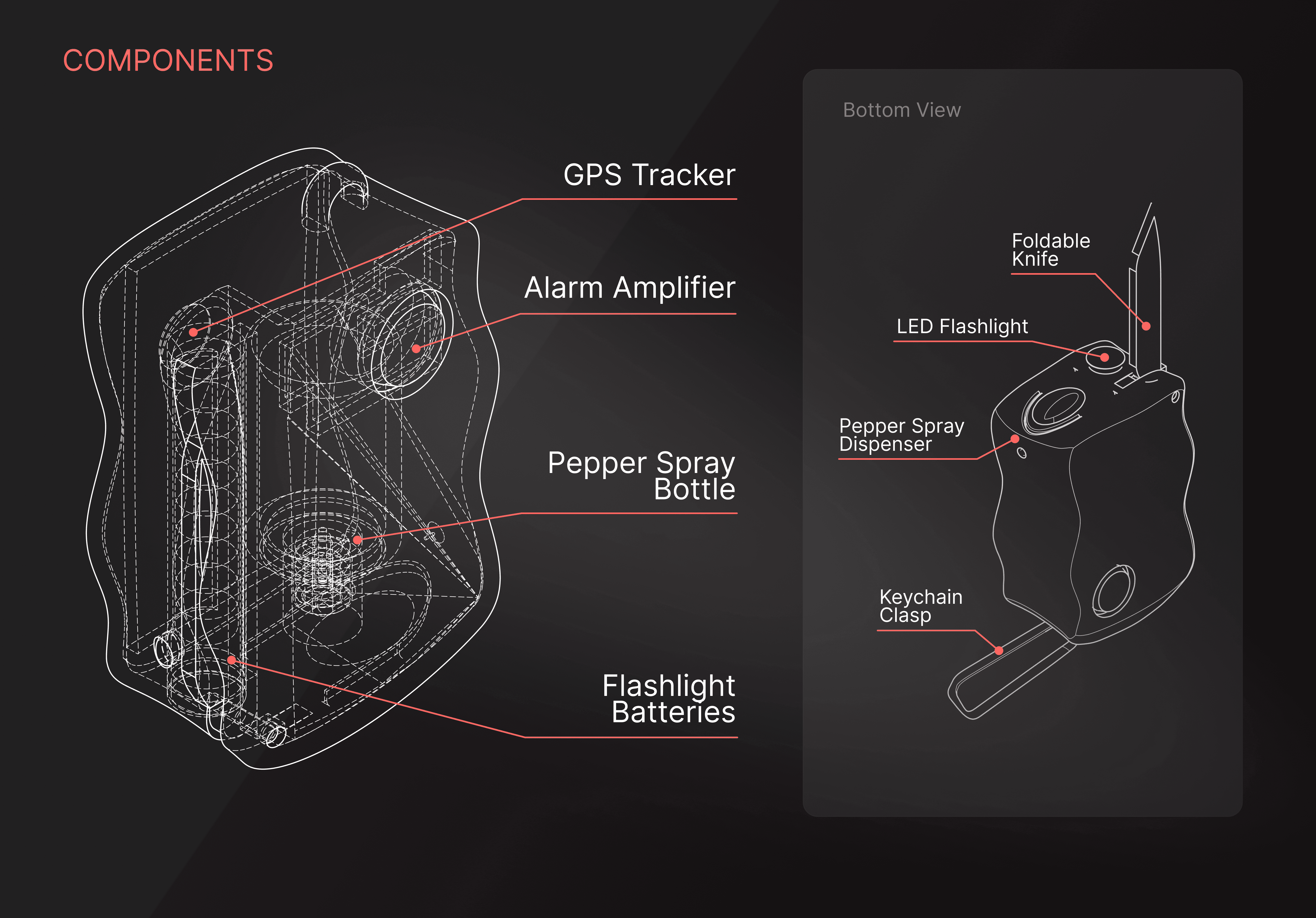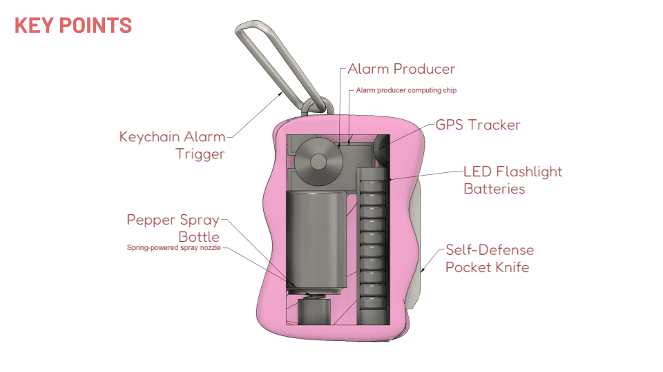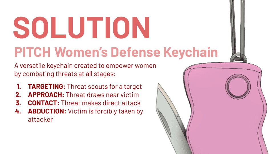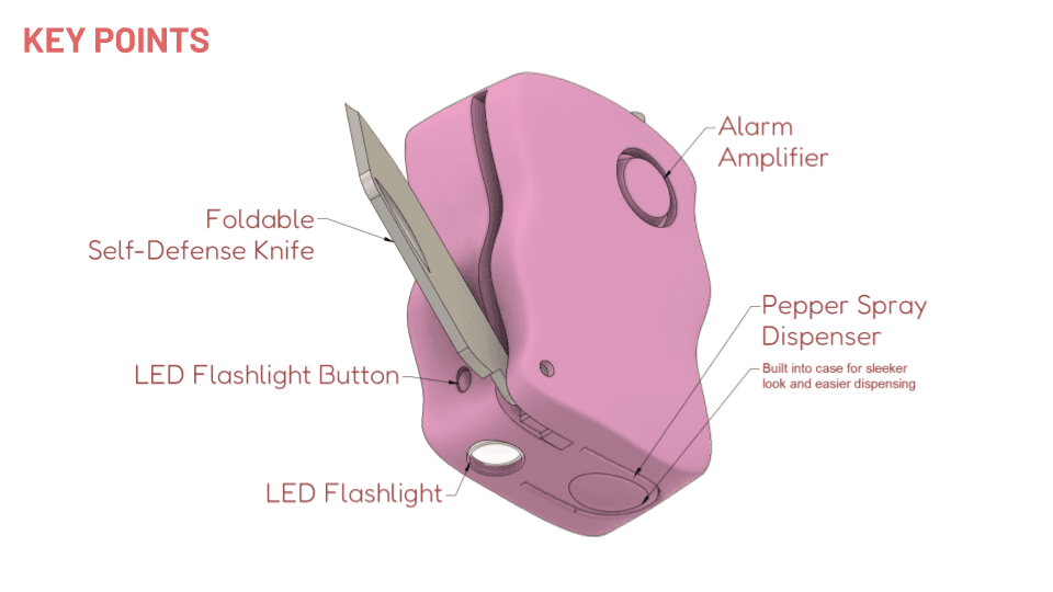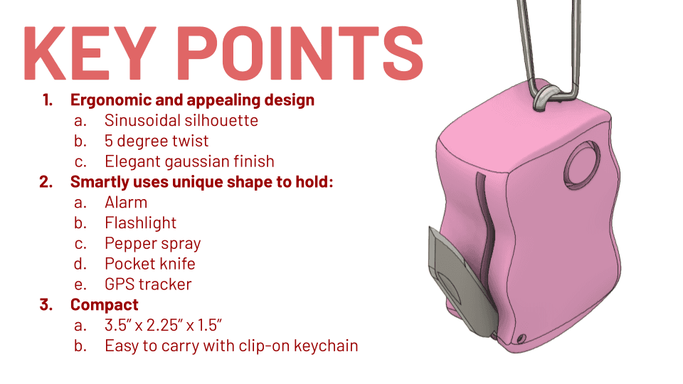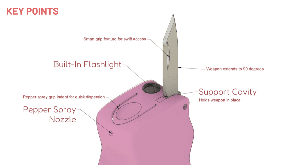 I talked to real women in Houston about their experiences living in there to get a closer understanding of the problem. Along with online research, I sought to find how can women feel safe, not just in Houston, but in general from bodily harm. With this information and my supplemental 3D modeling courses, I designed a self-defense keychain equipped to protect women at every stage of an attack.