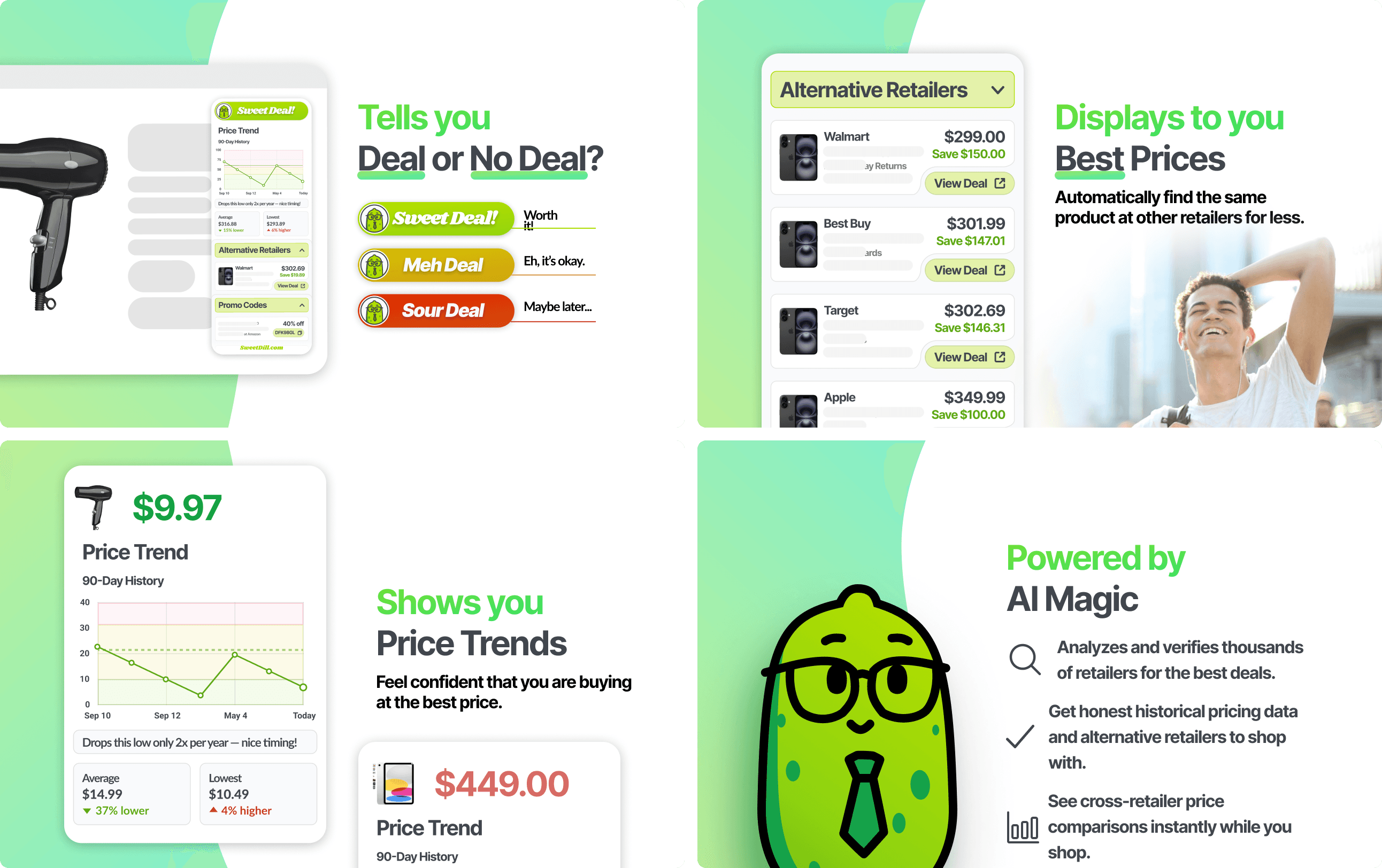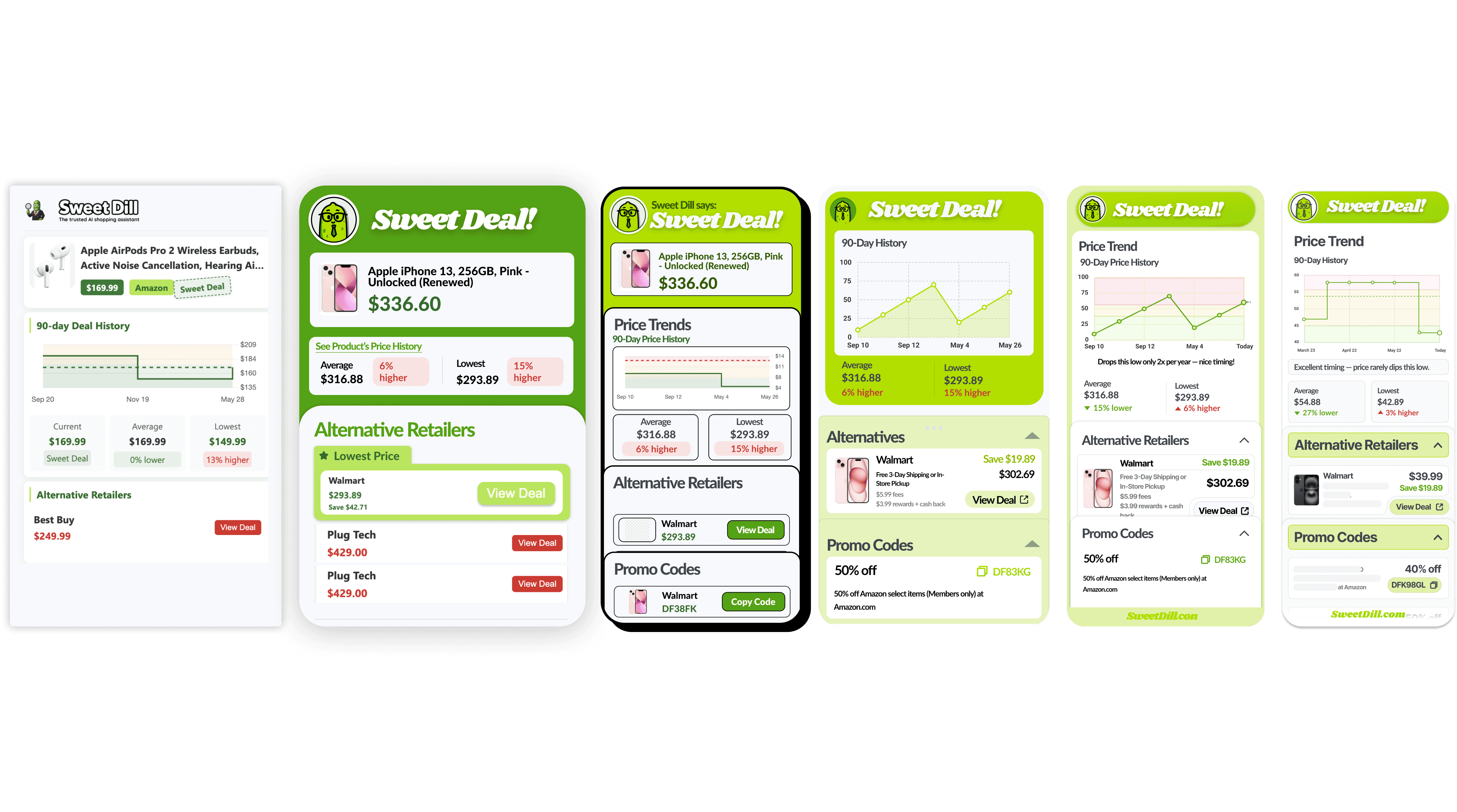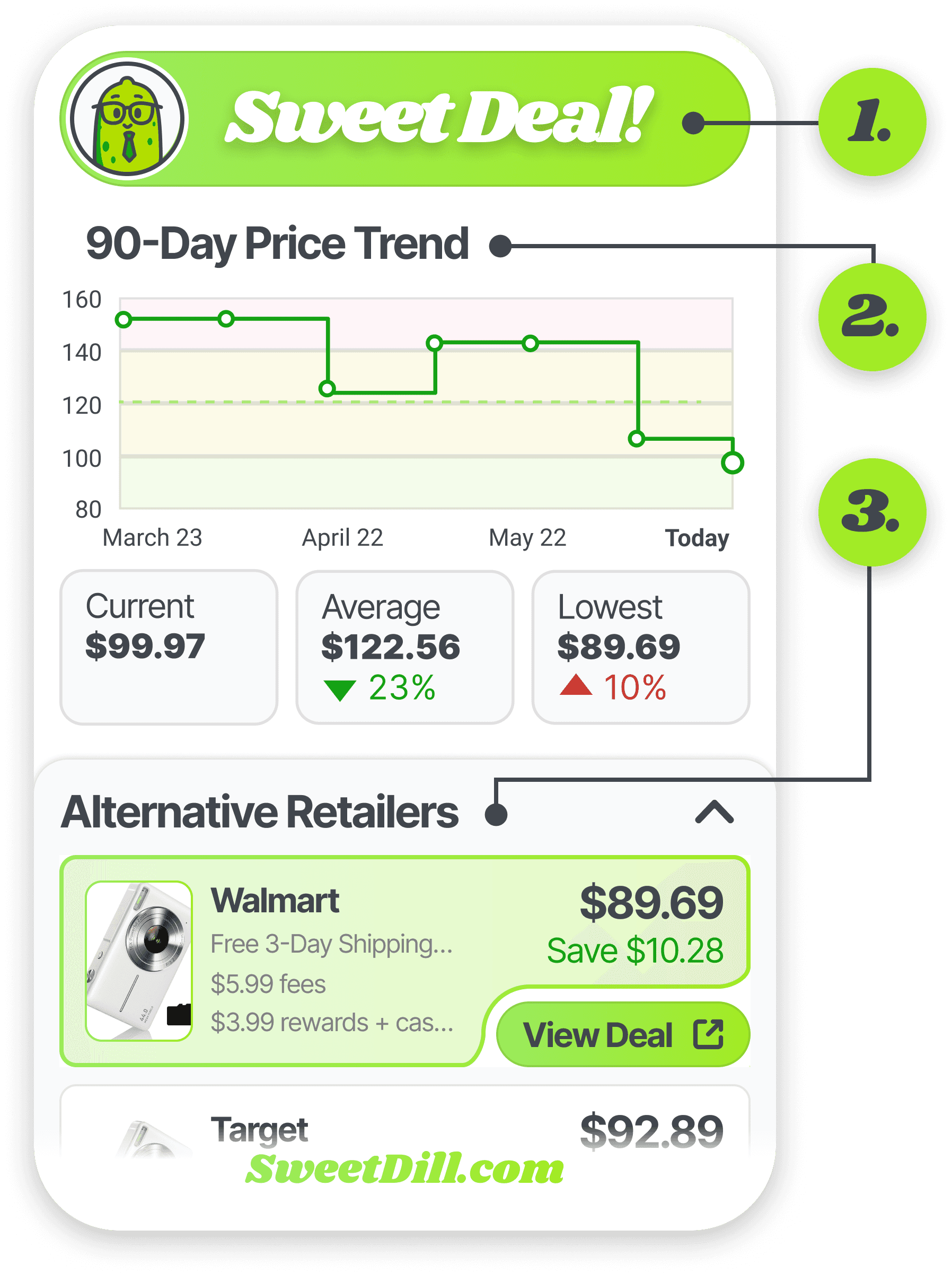 Sweet Dill tracks real-time and historical pricing across retailers, helping you understand whether today’s price is a true discount, a temporary dip, or simply average—so you can buy with confidence.