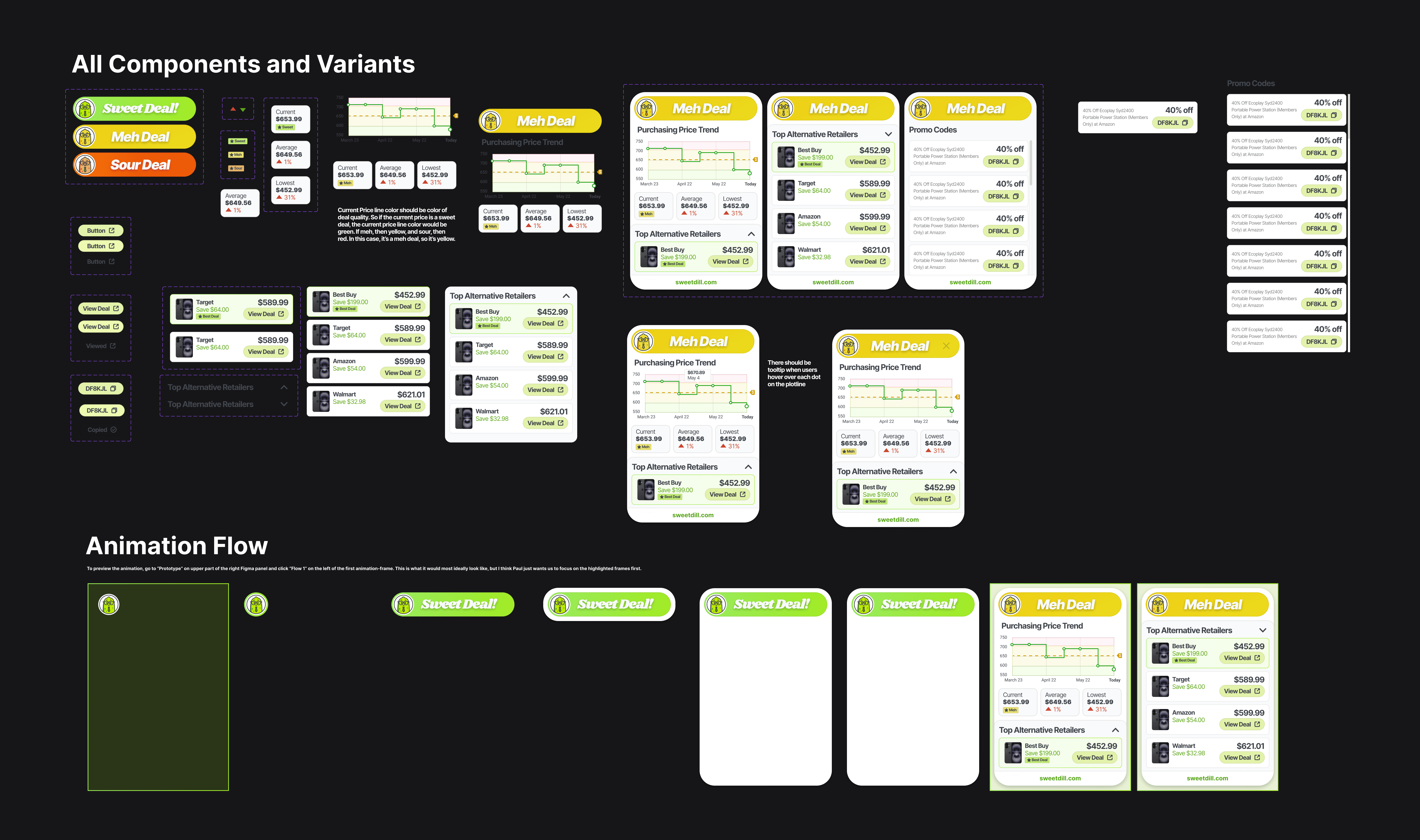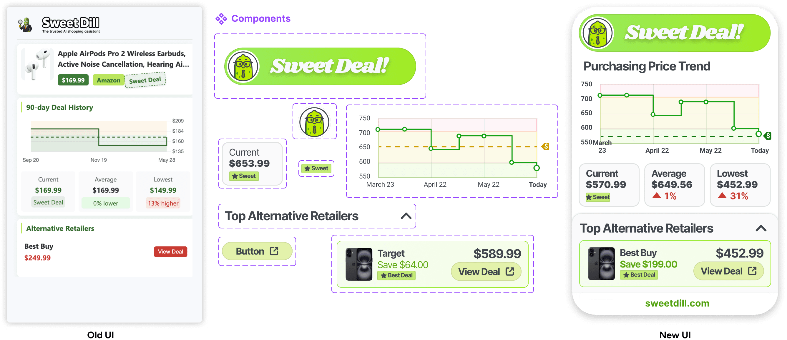 As the sole designer on the team, I learned to take notes on all aspects of the product, whether that is how AI is used to discover the best deals or how we are marketing our extension. This allowed me to see how my design fits into the rest of the Sweet Dill ecosystem, enabling me to create designs that align with our messaging while also intuitive for developer hand-off.